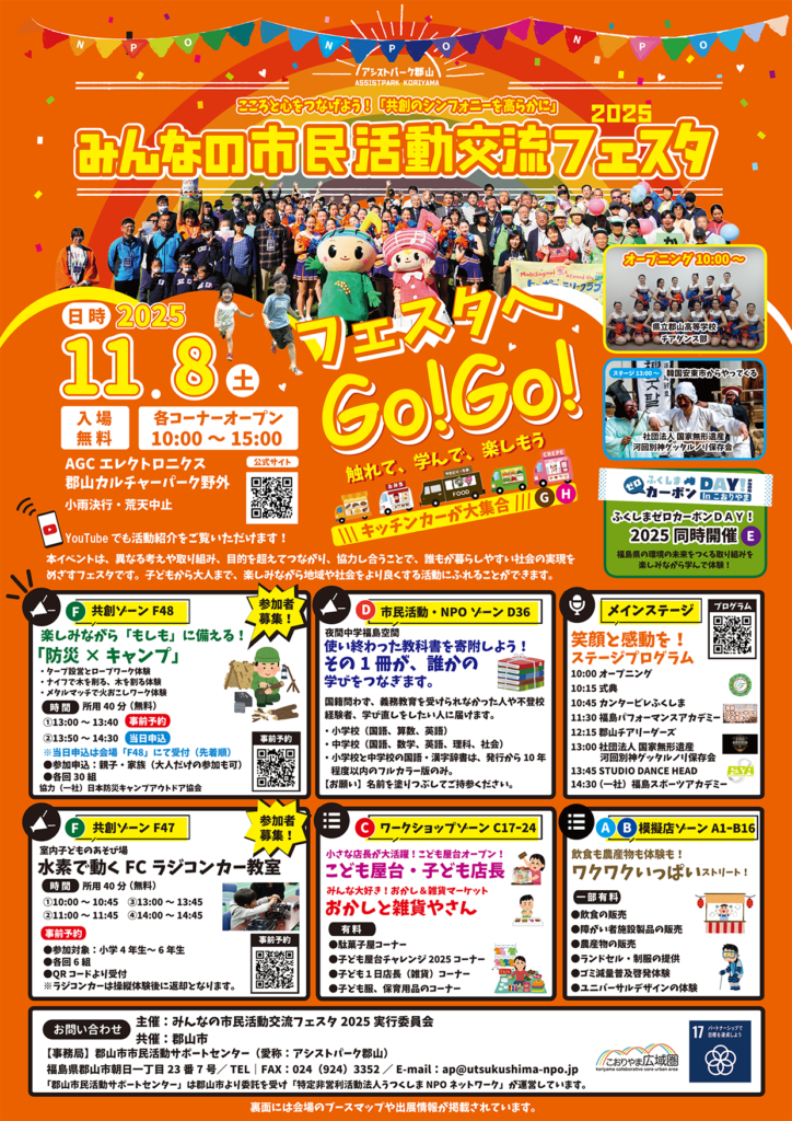 2025年10月8日 / 最終更新日時 : 2025年10月16日 unn 福島県内外のイベントについて 「ふくしまゼロカーボンDAY!2025」のご案内(郡山) 「みんなの市民活動交流フェスタ2025」開催のご案内 画像をクリックするとPDFでチラシ(表裏)を閲覧できます 「福島県カーボンニュートラル」の実現に向けて、県民一人ひとりが地球温暖化防止活動に取り組んでいただくため、環境イベントを通して情報発信します。